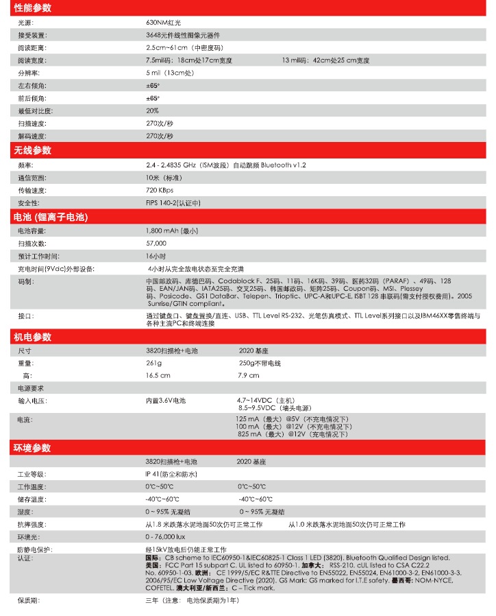 3820将独特的Adaptus影像技术和蓝牙无线连接相结合,为零售商及商用无线条码阅读带来业界领先的性能和耐用度.有了无线条码阅读器,操作人员就可以自由走动,快速、安全而舒适的读取条码数据,拥有10m工作范围和61cm阅读距离.