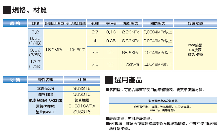 连接气体部位完全禁油处理品;高压气体官署认证品亦可采用;小型、轻量型;裂化特性绝佳。