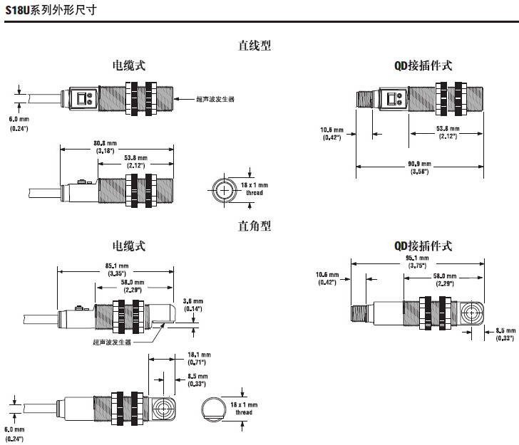 具有自诊断LED显示和按键设定功能; 最小的盲区; 声波反射检测模式; 带温度补偿功能; 可通过编程,对背景条件进行抑制; 可选择模拟量或开关量输出的型号;